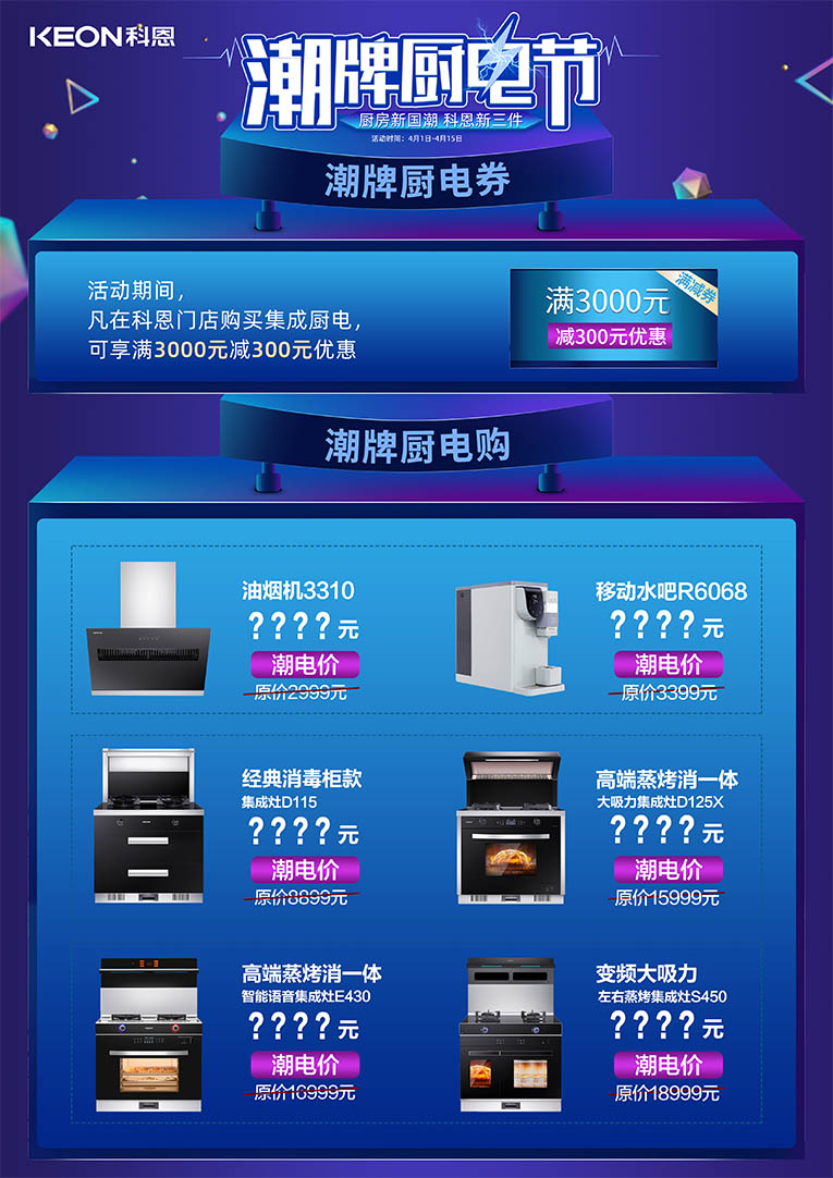 除此之外,更有科恩全國(guó)六大戰(zhàn)區(qū)同時(shí)發(fā)力,只為給全國(guó)用戶帶來(lái)瘋狂特惠!!4月1日——4月15日,進(jìn)科恩門店,潮牌廚電節(jié),更多驚喜等你揭秘~