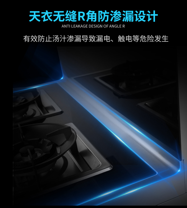 黑晶防爆鋼化玻璃灶臺面板,硬度高,韌性強,外觀時尚動感,搭配天衣無縫R角防滲漏設計,不僅易清潔易打理,更能有效防止湯汁滲漏導致的漏電、觸電等危險發生。