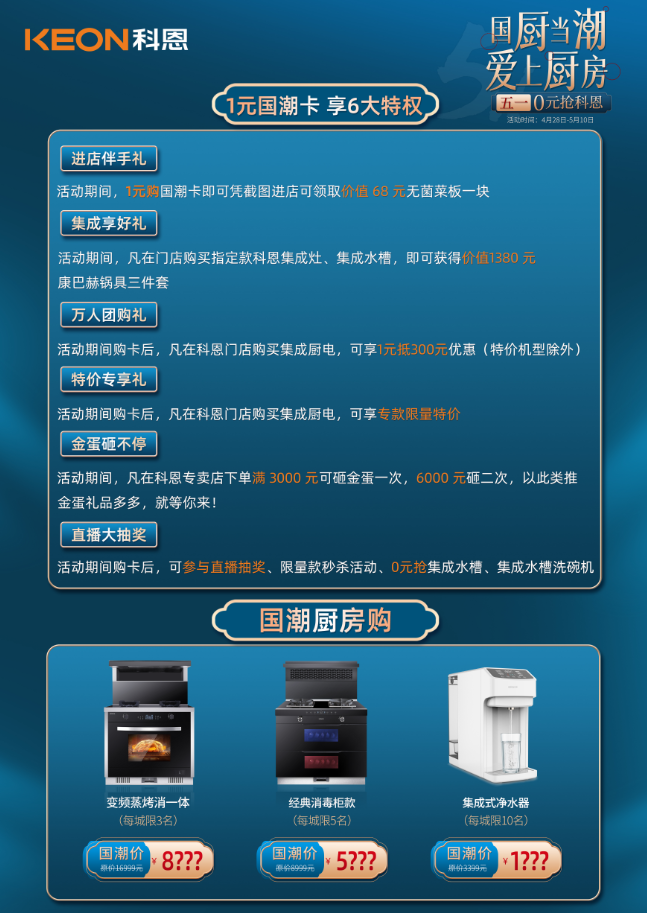 1元國潮卡,限時搶購!購買1元國潮卡,憑截圖即可進店領取價值68元無菌菜板,1元抵300元優惠,同時,可享六大特權!沒有中獎的朋友們也不用氣餒,我們的第二輪直播大抽獎也在緊鑼密鼓的準備中,5月9日晚上7點,提前準備好1元錢購買國潮卡,進入直播間,下個幸運兒就是你!