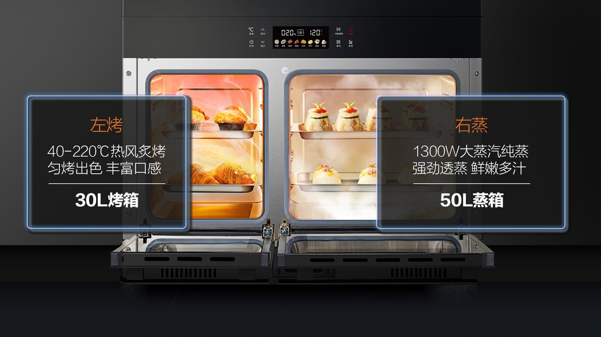 同時A3系列左烤右蒸款,可一次烹飪10道菜肴,真正實現(xiàn)倍速烹飪。蒸箱采用3D澎湃蒸,1300W大蒸汽純蒸,食物更鮮美;烤箱采用立體勻烤,頂部環(huán)形加熱管+循環(huán)風機+底部隱形加熱管,烤的更美味,且具有無油空氣炸功能,讓炸更健康,輕松解決小朋友愛吃薯條又不健康的難題。