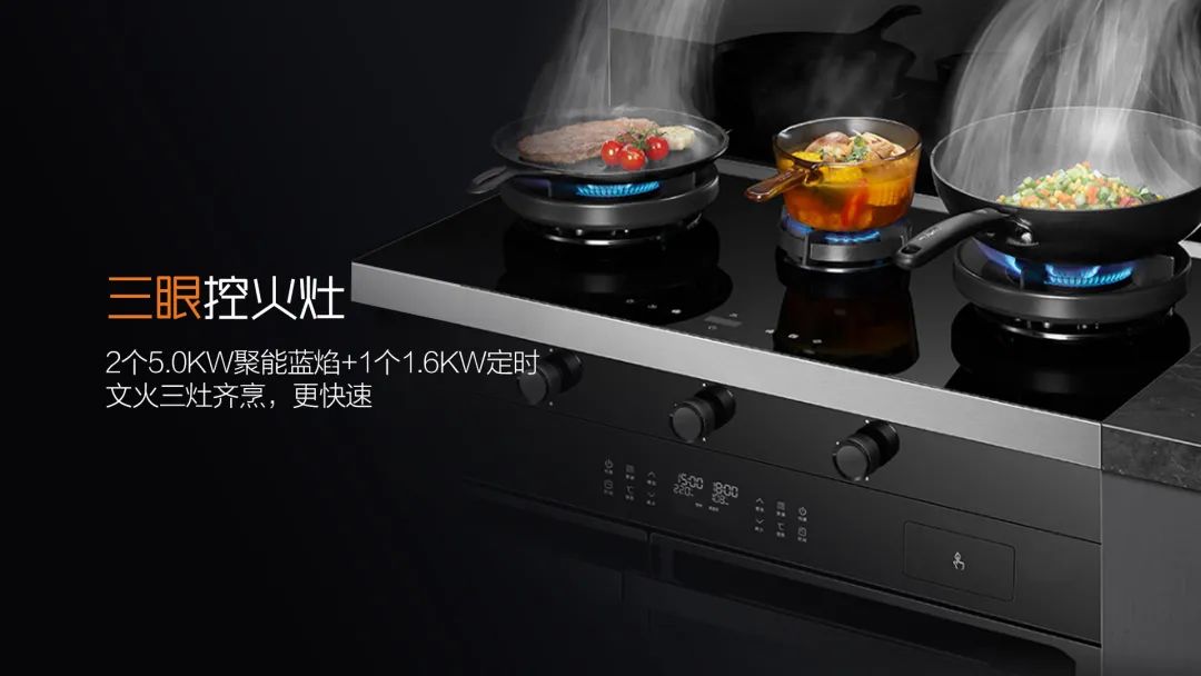 科恩A3系列獨特的三眼控火灶設置,可完美適配三代同堂家庭,2個5.0KW聚能藍焰+1個1.6KW定時文火,同時滿足爆炒和煮輔食的需求。且1.6KW小火慢煮,讓輔食擁有自己的專屬火力,無需費力調整,開啟就是最佳火力。