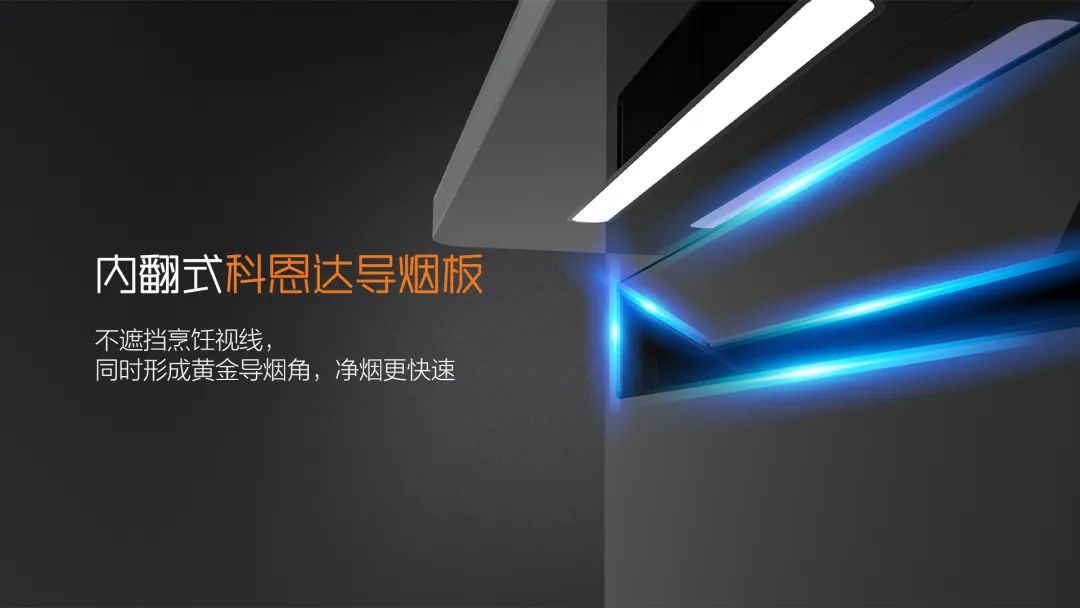 特有的內傾科恩達導煙網(wǎng)板不遮擋視線,且形成獨特的吸煙黃金角,讓油煙在鍋口就被吸走,0跑煙,廚房更清新!