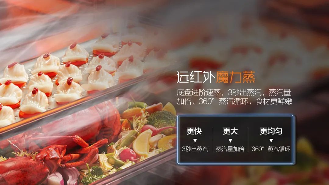 3D澎湃蒸:1300W大蒸汽純蒸,瞬間制熱360度包裹食材,讓食物更鮮美。