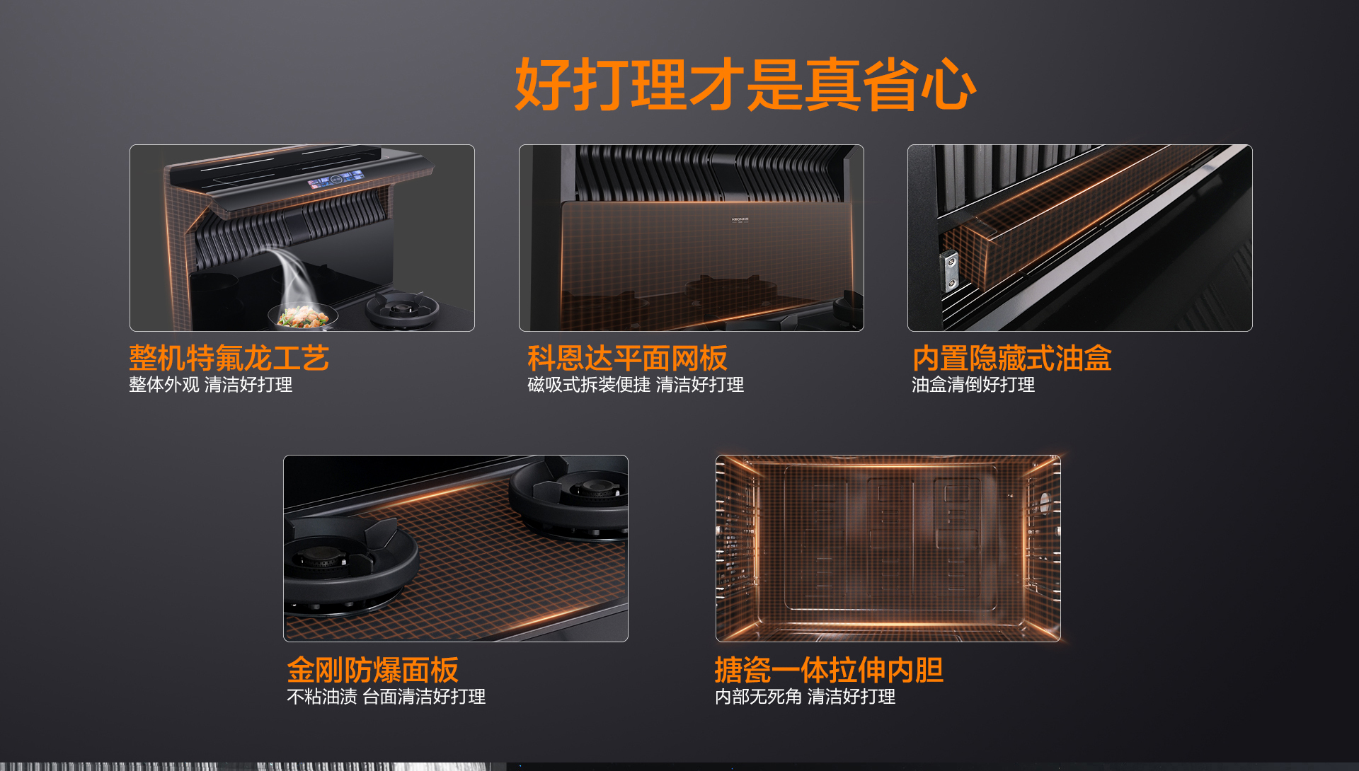 1. 防爆免清洗集成灶整機(jī)采用特氟龍工藝,不沾油好打理,污漬一抹即凈!
