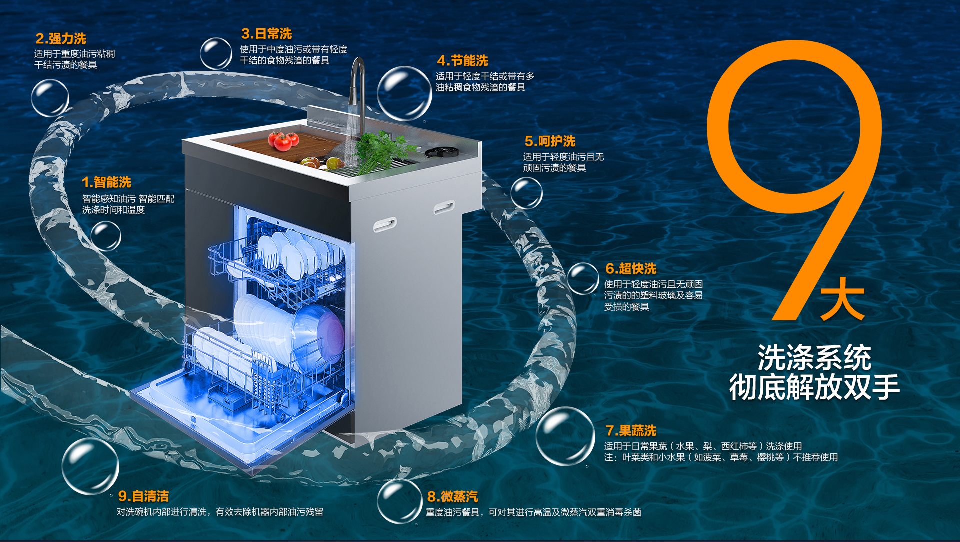 一臺(tái)頂五臺(tái):水槽、洗碗機(jī)、果蔬凈化器、消毒柜、櫥柜融為一體,1平米就足以解決廚房清洗難題。