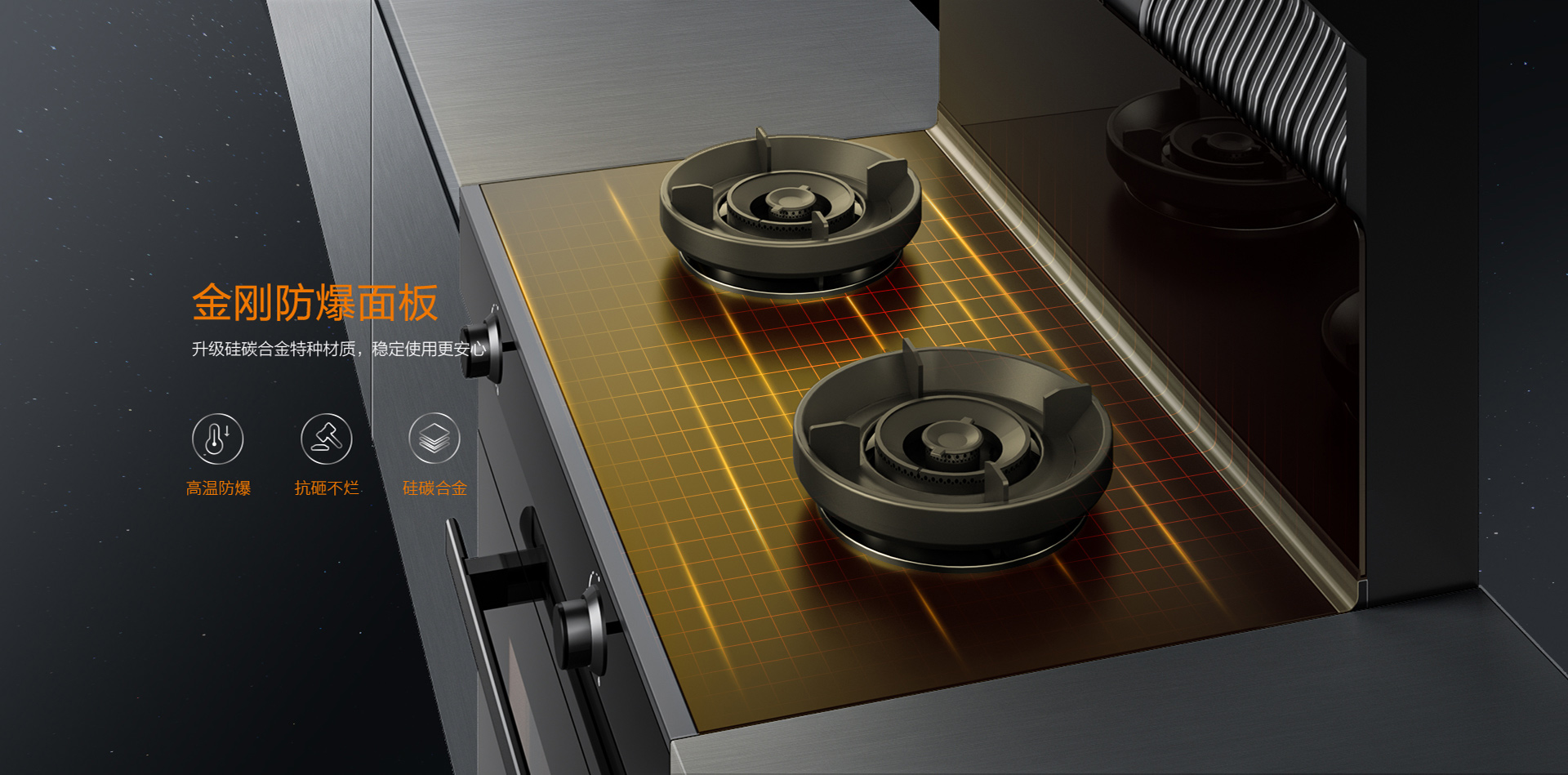 科恩KN700金剛防爆灶在材質上選擇了防爆金剛板,硅碳合金特種材質可耐高溫1500℃,高于國標3倍以上,更安全!在抗沖擊方面,防爆金剛板是能抗住工地大鐵錘的暴擊,真正做到0級防爆高硬度,更堅固,更安全!如此有效杜絕了廚房安全事故。