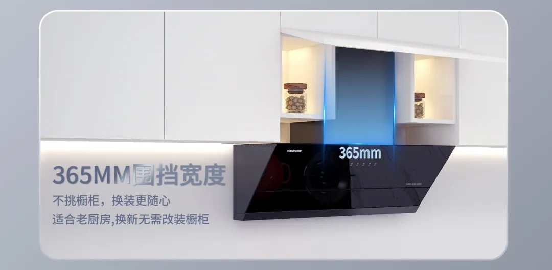 首先,其機身超薄,換裝免改這一特點,對于老廚房來說簡直是一大福音。無需對廚房進行大規模改造,就能輕松安裝。365MM圍擋寬度,不挑櫥柜,換裝更隨心。無論你的櫥柜尺寸如何,科恩5200超薄油煙機都能完美適配,讓你的廚房改造更加順利。