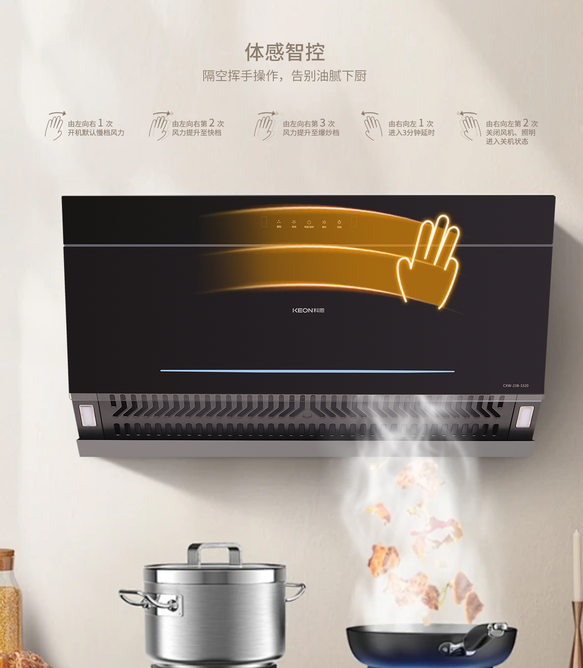 科恩3320煙機具有諸多顯著優勢。首先,煥新不改柜,小巧的機身能夠輕松安于任意櫥柜之間,無需對櫥柜進行大規模改造,為用戶節省了時間和成本。