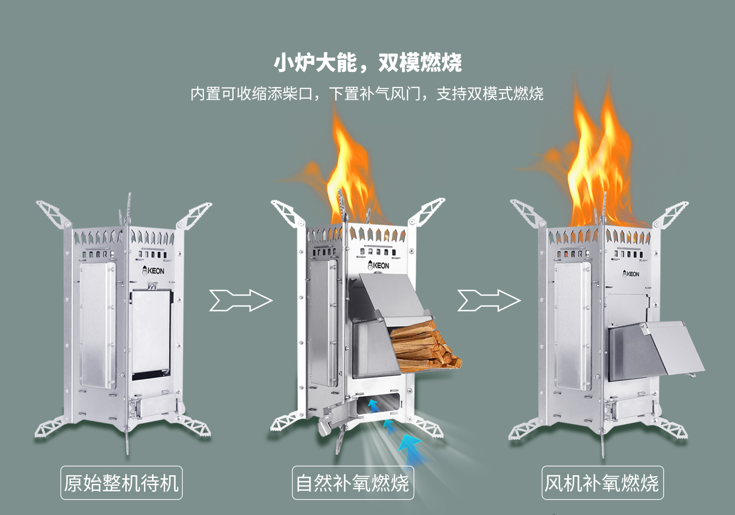 傳統爐灶的嗆鼻濃煙模糊了山色,科恩提供全新解決方案,火箭爐S12設置3D繞流供氧系統??茖W供養,猛火無煙,可調支撐腳,穩立碎石坡地。熱效率超傳統爐具250%,省柴省心更省空間,從野餐到探險全覆蓋。