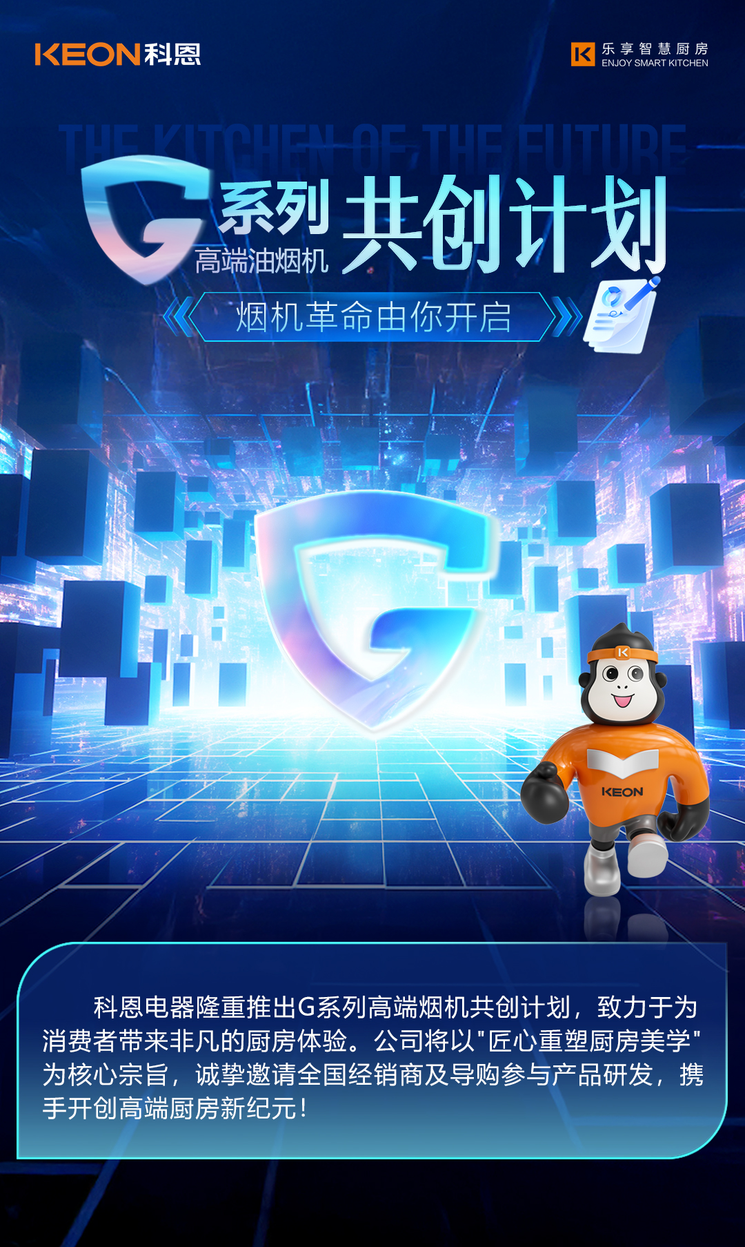 廚房,是家的心臟,承載著無(wú)數(shù)溫暖與美味。科恩以用戶視角為核心,為打造極致廚房體驗(yàn),正式啟動(dòng)2025 G系列高端油煙機(jī)合作伙伴共創(chuàng)計(jì)劃。公司將秉持“以匠心重塑廚房美學(xué)”的產(chǎn)品理念,誠(chéng)邀科恩全國(guó)經(jīng)銷商、導(dǎo)購(gòu)、售后參與產(chǎn)品研發(fā),開(kāi)啟金點(diǎn)子征集行動(dòng),共同攜手,開(kāi)創(chuàng)高端廚房新紀(jì)元!