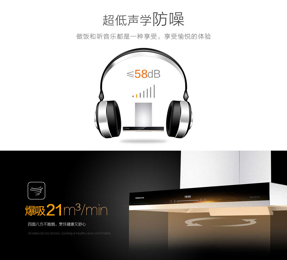 全腔900MM攏煙區(qū),比普通煙腔更寬更深,有效鎖住油煙不外溢。