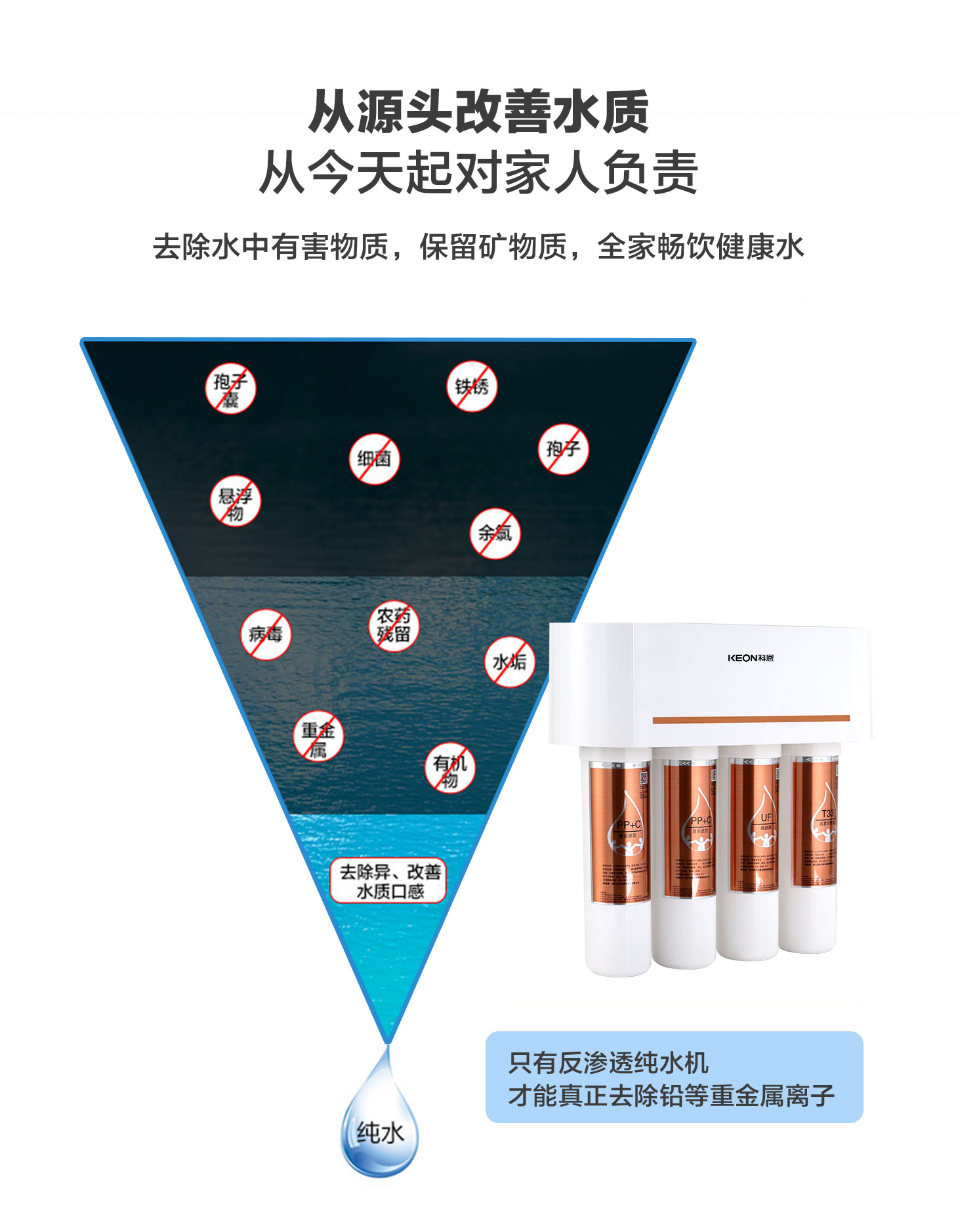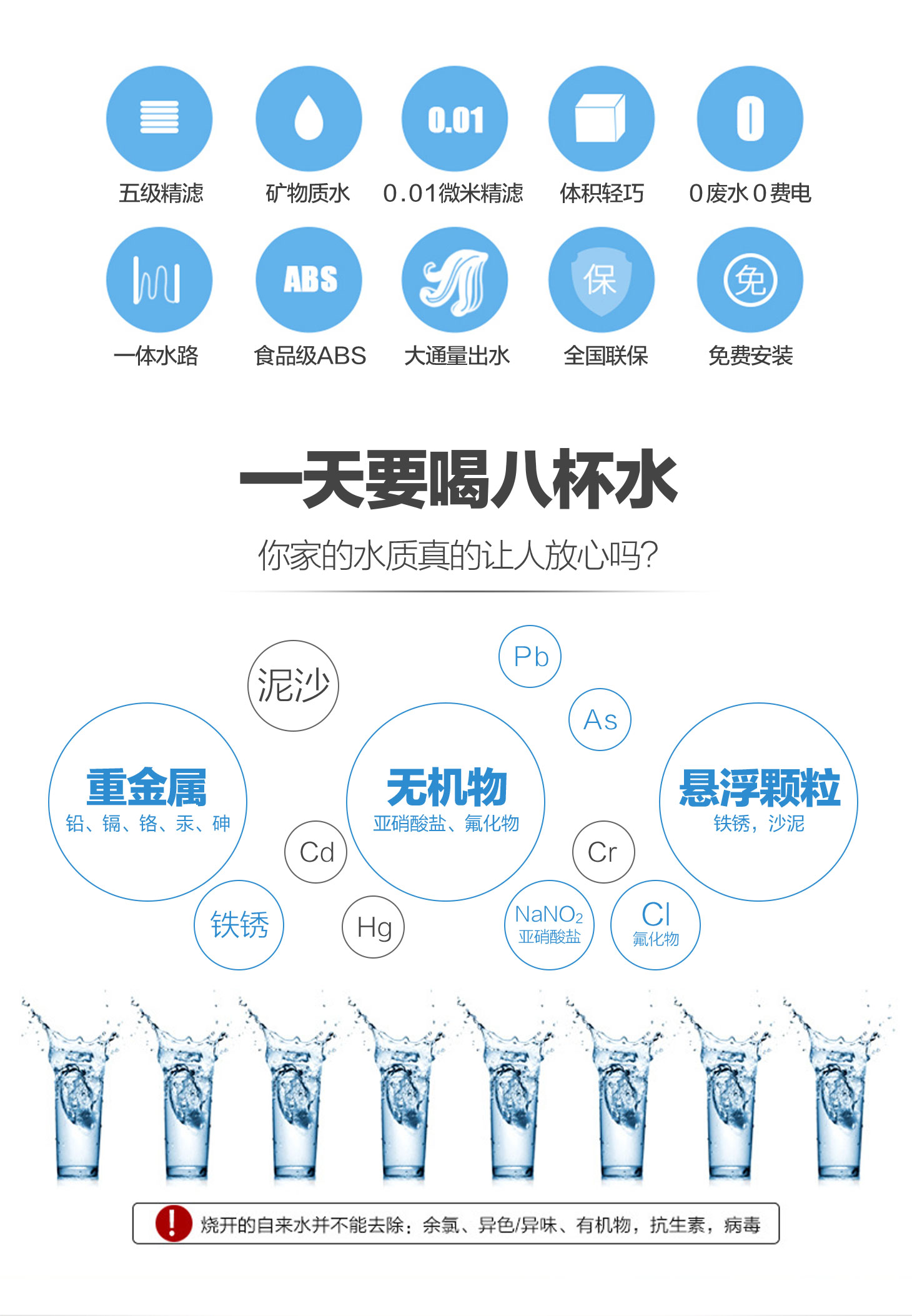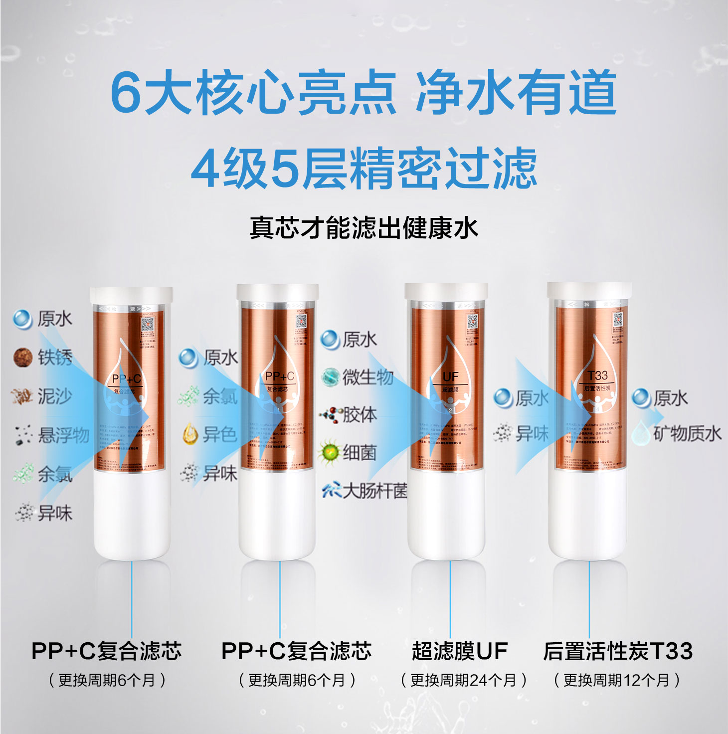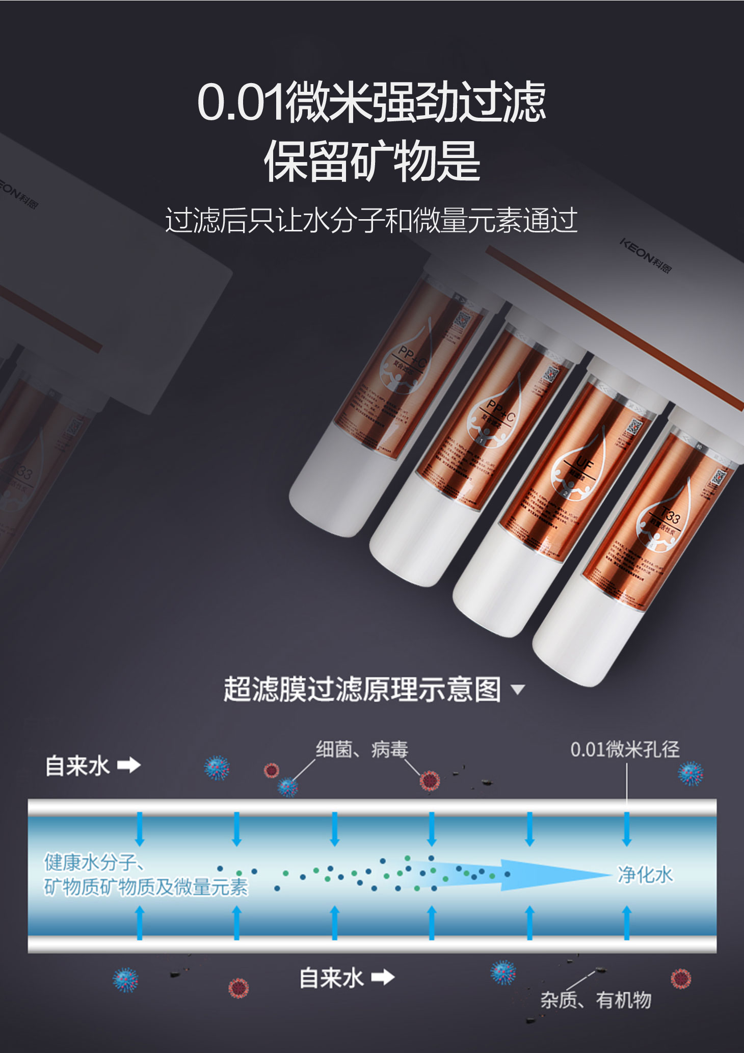 - 四重五級(jí)過濾,0.01微米超濾膜去除細(xì)菌和病毒。