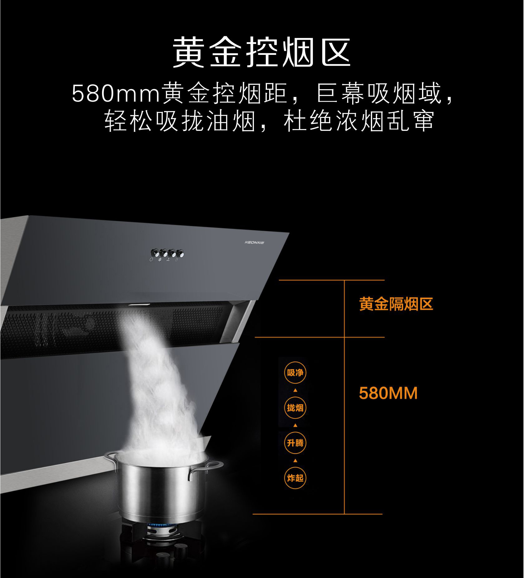 - 580mm黃金控?zé)熅啵弈晃鼰熡颍p松吸攏油煙,杜絕濃煙亂竄。
